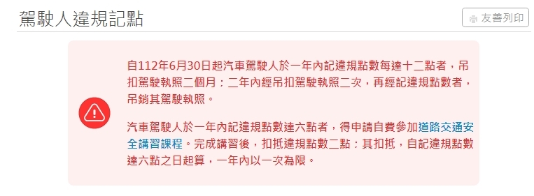 交通部新增違規點數累計期限至一年,在一年內達到12點依法吊扣駕照2個月處置,並新增13項檢舉項目,並在7月開始實施。